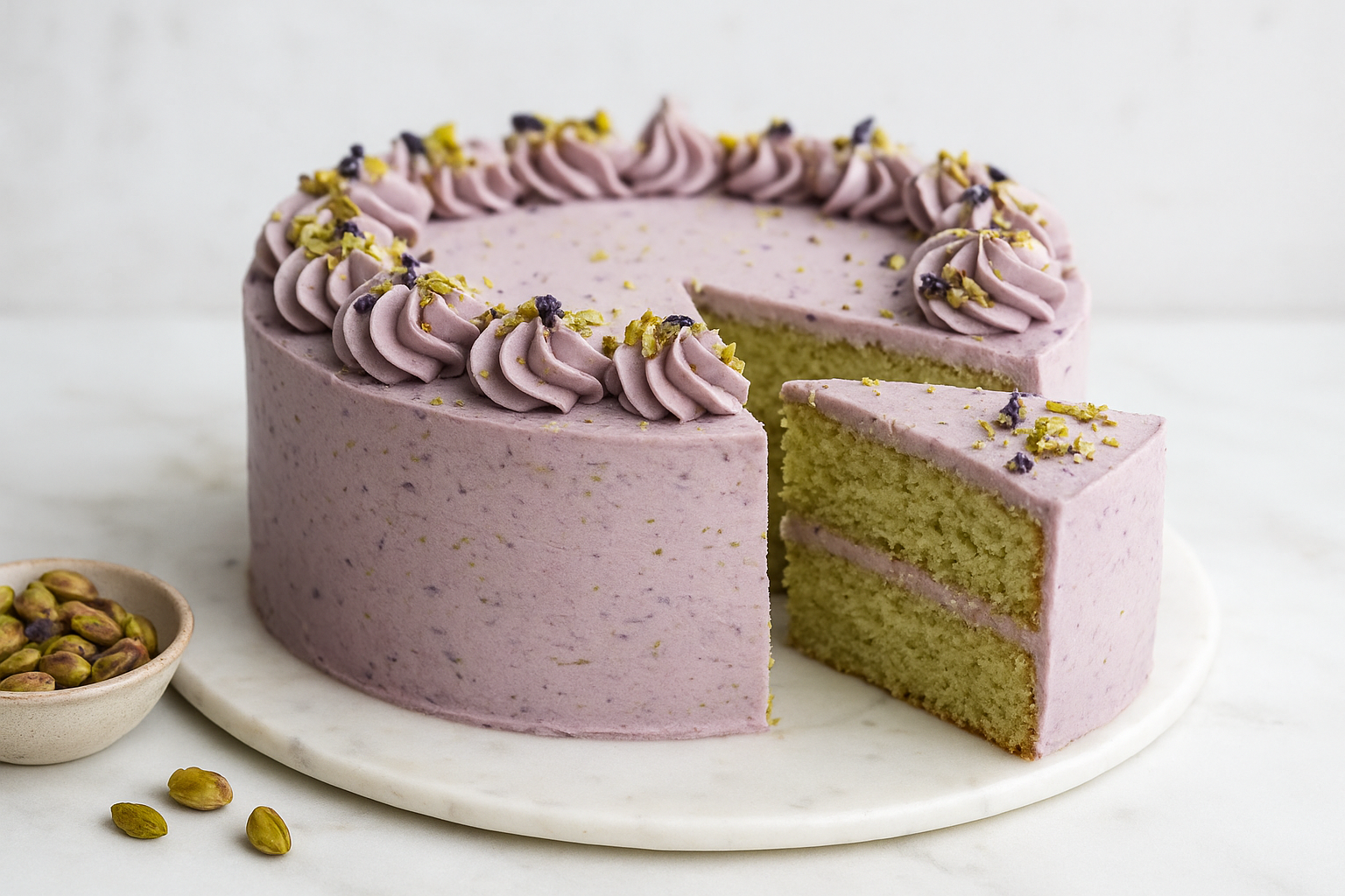 Our Pistachio Lavender Cake brings together two ingredients that balance each other beautifully. The earthy nuttiness of pistachios complements the soft, floral notes of lavender, creating a cake that tastes as luxurious as it looks.
